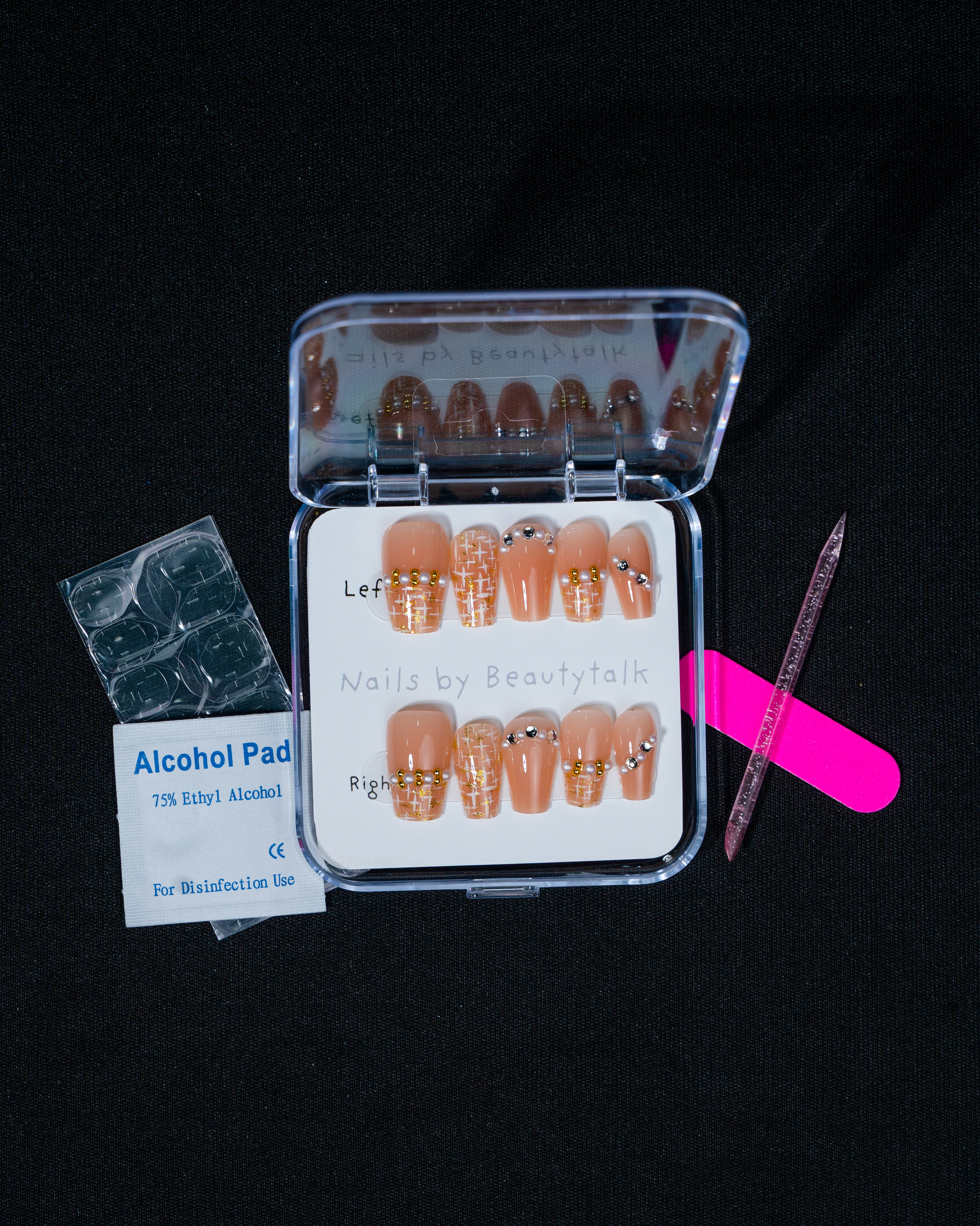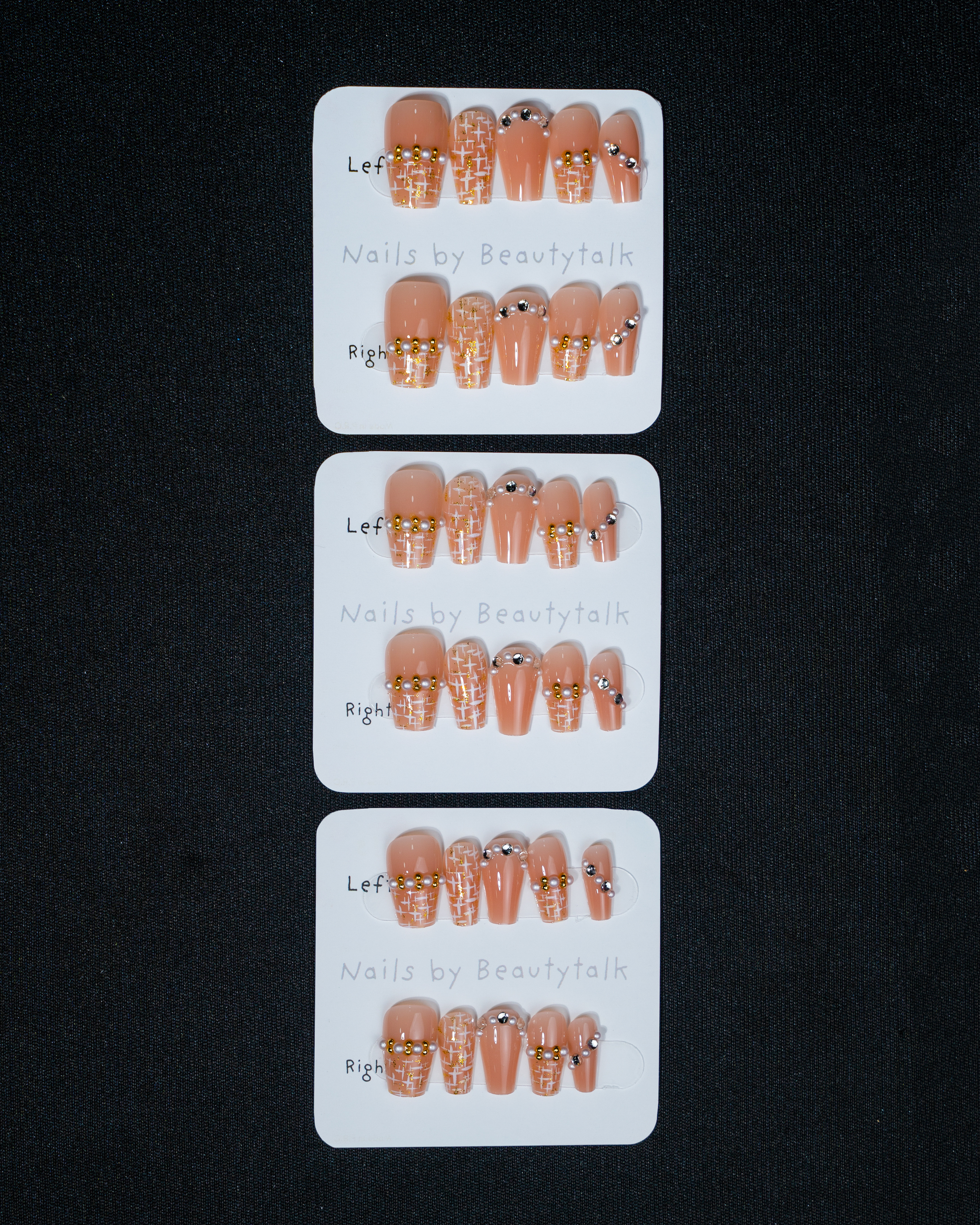 A peach-toned nude press-on nail set with subtle French-style detailing, gold accents, and small rhinestone embellishments. Designed for a neat, polished look suitable for everyday wear or occasions.