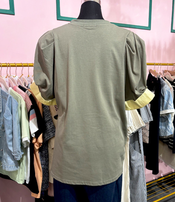 Puff Sleeves: The standout feature of this t-shirt is its puff sleeves, which add volume and a feminine touch to the classic t-shirt design. The puff sleeves are delicately gathered at the shoulders, creating a soft, romantic silhouette.
