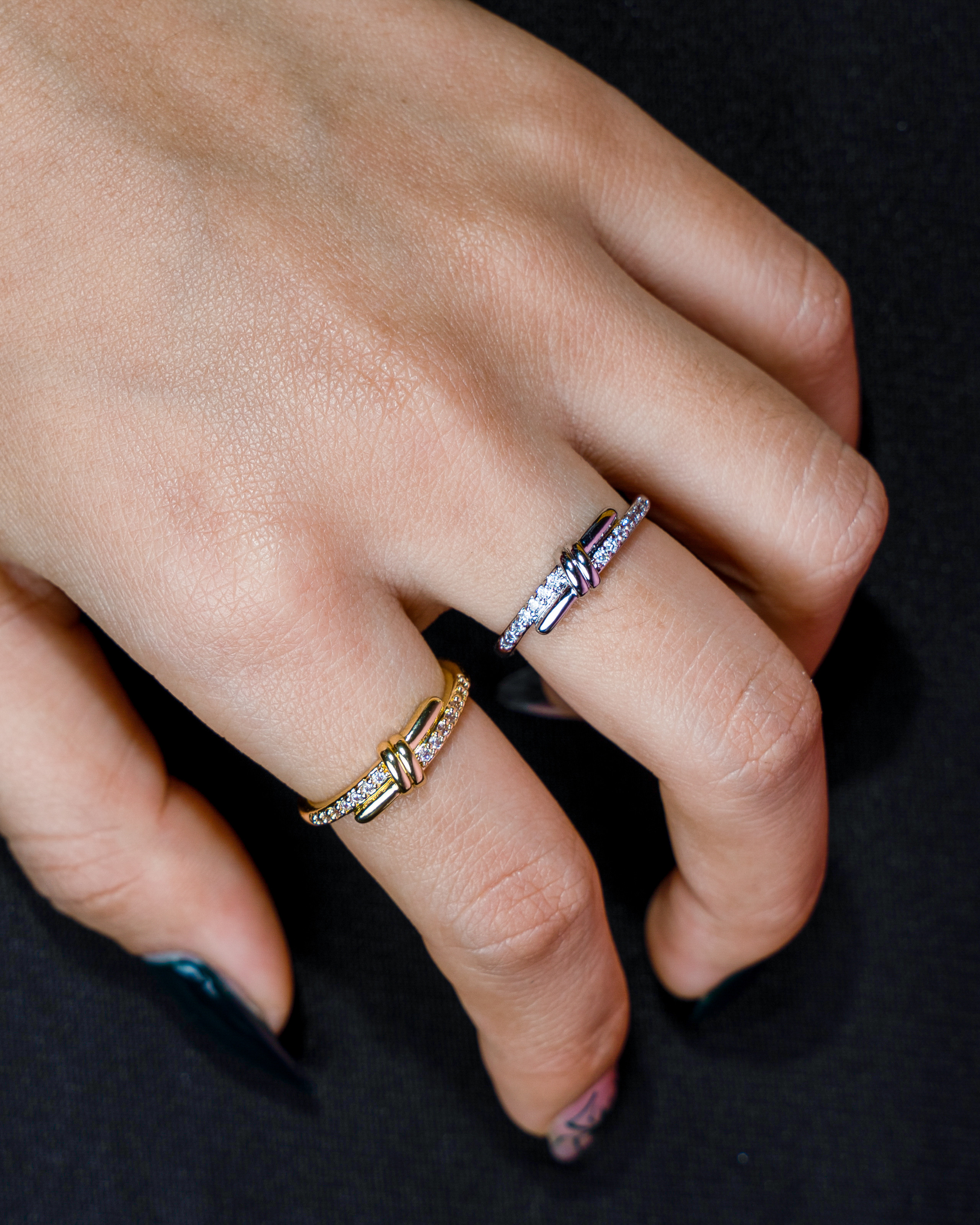 A modern knot-inspired ring with sparkling crystal pavé, finished in a sleek silver-tone for a clean, contemporary look. The intertwined design symbolizes connection and elegance, making it a subtle statement piece that works beautifully for everyday wear or special occasions. Lightweight, minimal, and easy to style with both casual and dressy outfits.